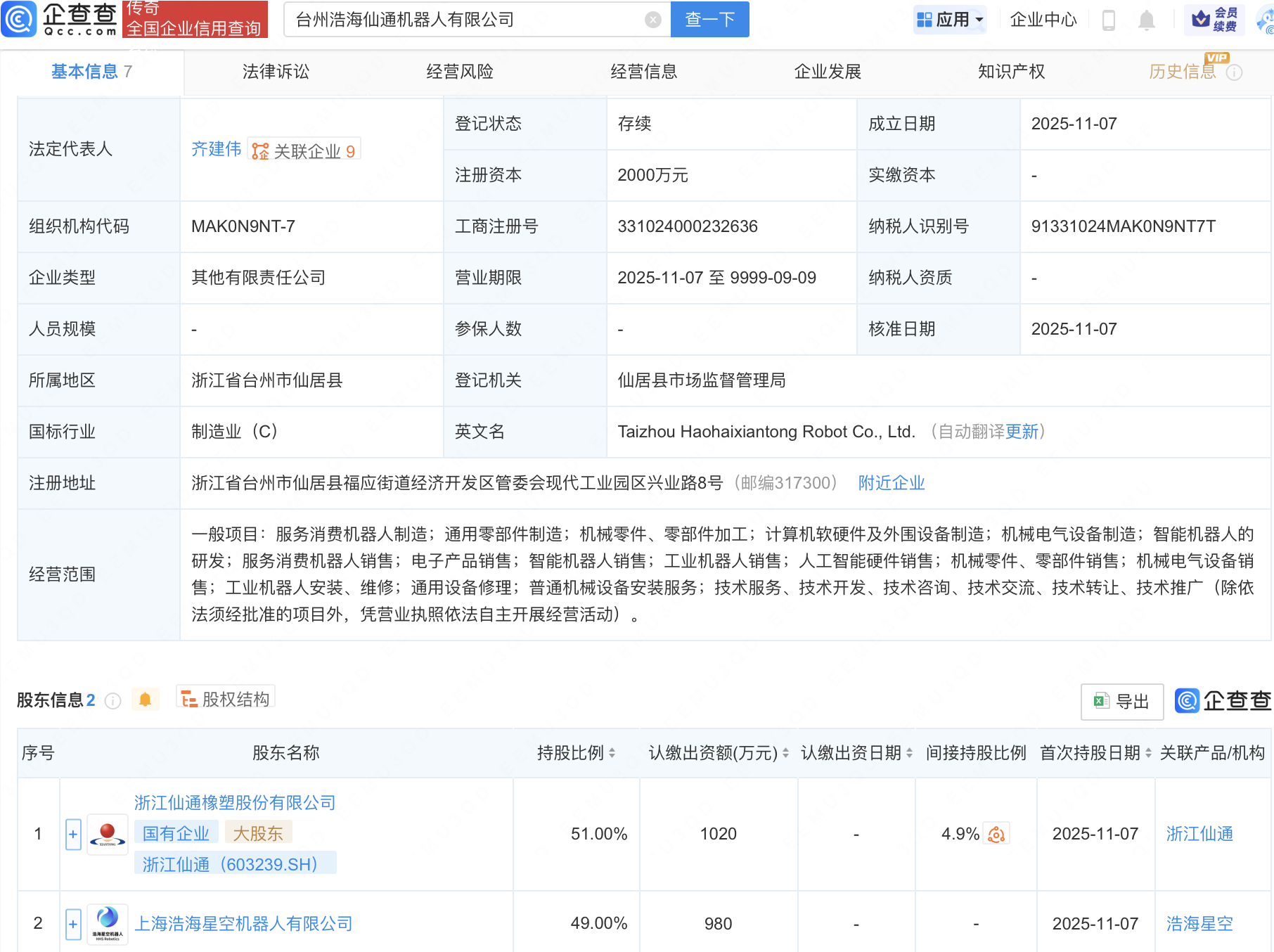近日,台州浩海仙通机器人有限公司成立,注册资本2000万元,经营范围包含:智能机器人的研发;服务消费机器人销售;智能机器人销售;工业机器人销售;人工智能硬件销售等。企查查股权穿透显示,该公司由浙江仙通(603239)等共同持股。