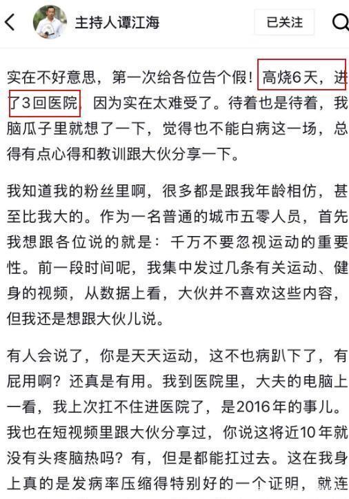 离开北京卫视的谭江海也开始做视频账号,时不时也会和妻子王小骞一起录制短视频。而在8日晚,社交平台停更两天的谭江海发文称要告假,他透露称因为高烧6天进了3回医院。
