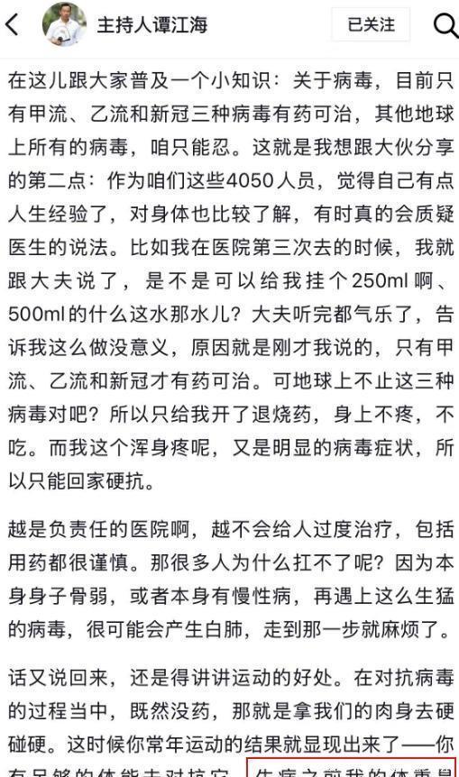 从谭江海的分享来看,虽说他已经53岁了,但日常坚持运动的他体质还是很不错的。谭江海表示上次扛不住住进医院还是2016年的事情,为此,他强调称锻炼还是很重要的。那这次谭江海生病看医生则是因为病毒感冒,他透露通过检查并不是甲流,乙流和新冠,但反复高烧,而且浑身疼又是明显的病毒症状,实在扛不住的他去医院要求输液,但被医生告知只有上面提到的三种病毒才有药可治,其他所有病毒只能硬抗。