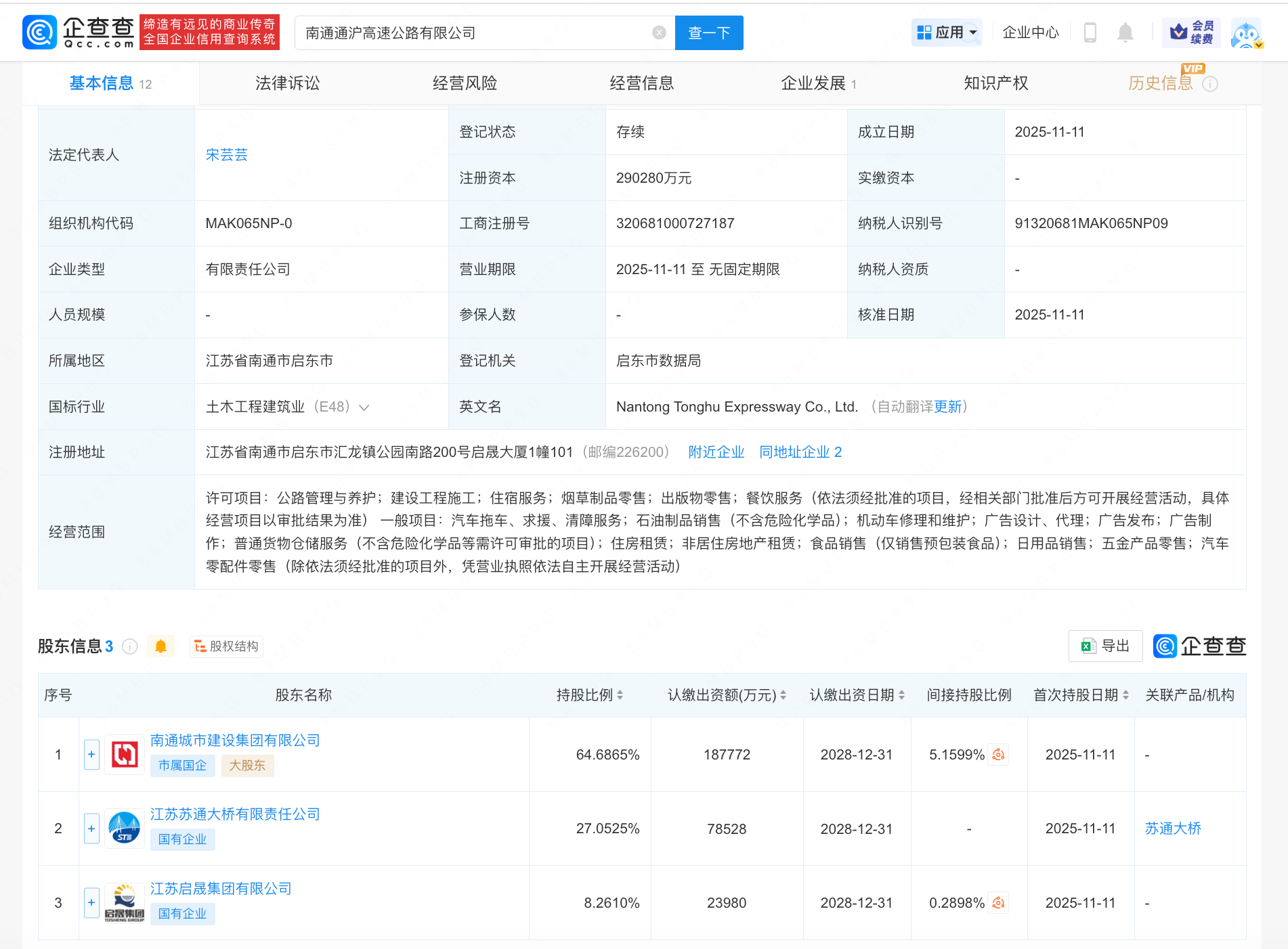 近日,南通通沪高速公路有限公司成立,法定代表人为宋芸芸,注册资本约29亿人民币,经营范围包括公路管理与养护、建设工程施工、住宿服务等。企查查股权穿透显示,该公司由南通城市建设集团有限公司、江苏苏通大桥有限责任公司、江苏启晟集团有限公司共同持股。